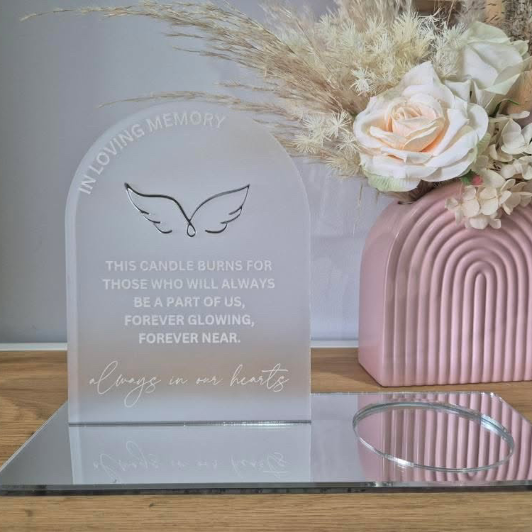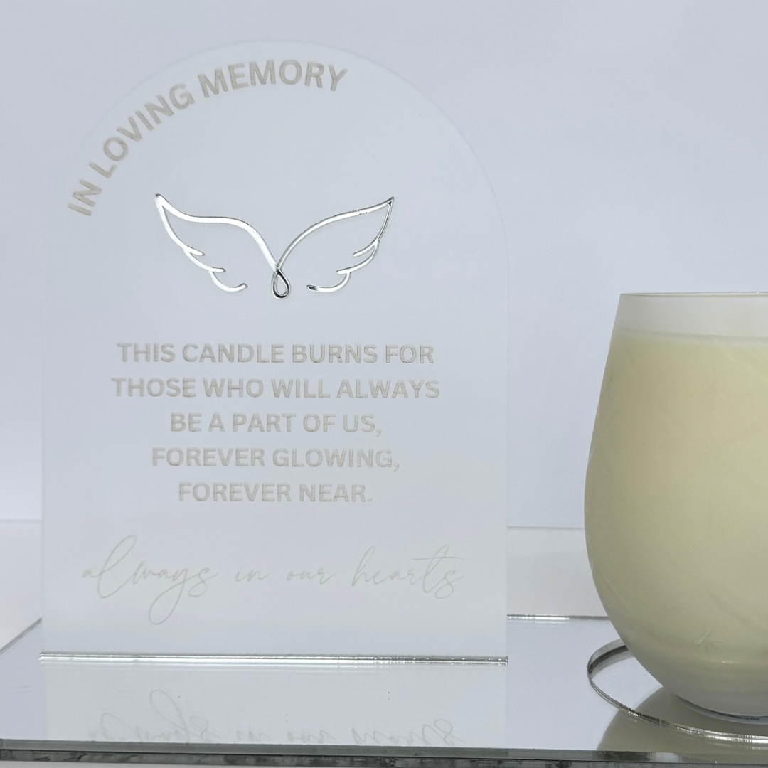 - Memorial Plaque – A delicate keepsake to honour cherished loved ones, offering a lasting tribute to those who will always be with us. The plaque is made of frosted acrylic with an engraved design, complemented by silver mirror wings and a matching stand.